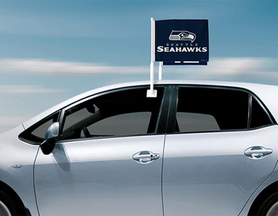 Custom premium 2 ply car flag. (double sided with insert liner). Comes complete with 20" Stiff Heavy Duty Plastic pole that has been specially designed to fit easily onto the window of any car. Pole takes only seconds to clip on or to take off and will not damage or harm the window. Car flag is made of the most durable wrap knit heavy duty silk like material. It is 100% polyester. Flag is all UV protected from the sun so that it will never fade. **SINGLE SIDED: SEE PRODUCT# CMCFPR1PL**